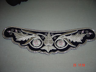 Funda para la parte sin tallar del pie de cruz de Nuestro Cristo de la Buena Muerte con el escudo bordado de la Hermandad del Lunes Santo de Ayamonte.