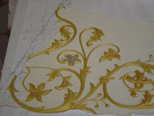 Limpiado del simpecado y elaboración de trabillas y texto representativo de la Hermandad de Nuestra Señora de las Angustias (Patrona de Ayamonte).